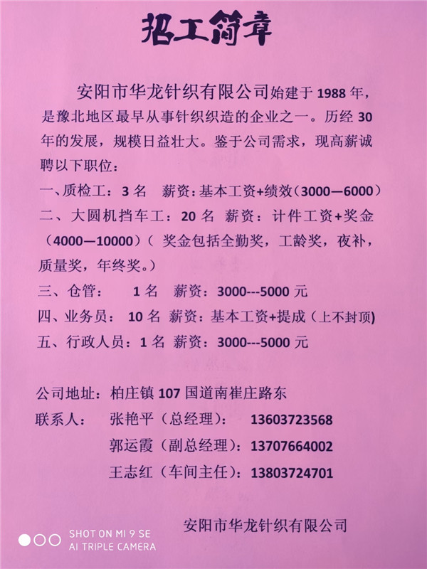 安陽市華龍針織有限公司招聘